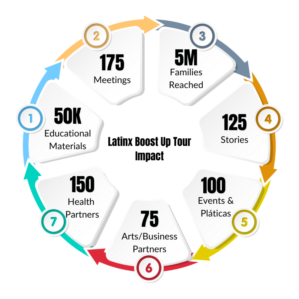 This tour spanned 25 cities, where we held over 175 meetings, organized over 100 events and pláticas, and conducted more than 125 interviews to capture community stories. Through these efforts, we disseminated over 50,000 bilingual educational materials and established partnerships with over 150 health-specific organizations and 75 arts/small business sectors. And over 5 million families were reached.
