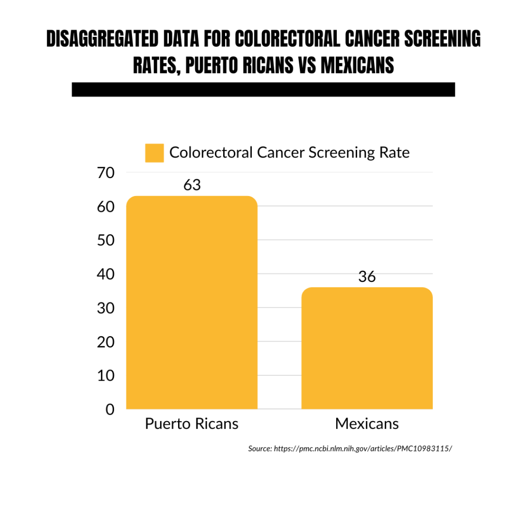 Health Outcome Variations: Disaggregated data reveal significant differences in health behaviors among Latino subgroups. For instance, colorectal cancer screening rates vary from 63.2% among Puerto Ricans to 36.0% among Mexicans, underscoring the importance of detailed data to address specific health disparities.