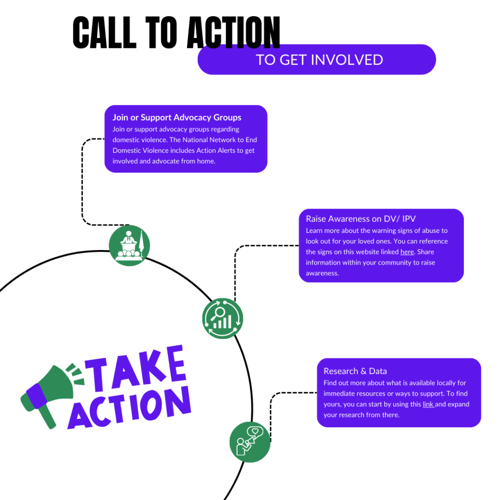 - Advocating: Raise awareness of available resources available to help support victims and ensure that people feel comfortable reporting avenues for domestic violence.