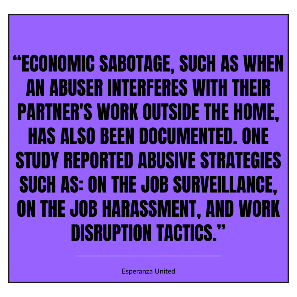 - “Economic sabotage, such as when an abuser interferes with their partner’s work outside the home, has also been documented. One study reported abusive strategies such as: on the job surveillance, on the job harassment, and work disruption tactics. However, they also found unique strategies experienced by Latinas, such as denying access to a driver’s license, lying about childcare arrangements, and sending the partner to their country of origin temporarily” link