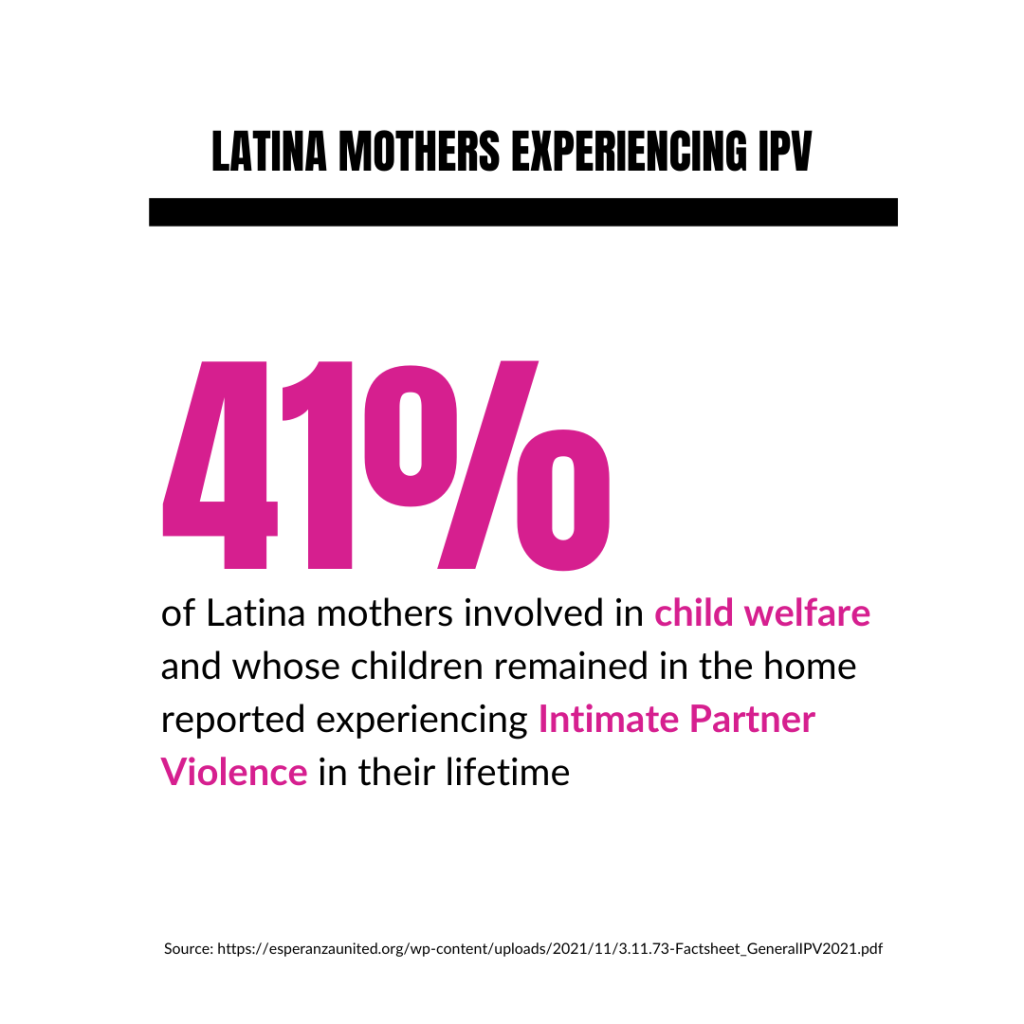 - 41% of Latina mothers involved in child welfare and whose children remained in the home reported experiencing Intimate Partner Violence in their lifetime. link
