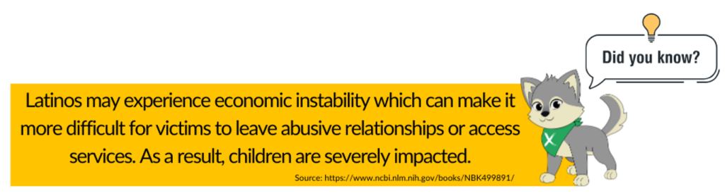 Children: Latinos may experience economic instability which can make it more difficult for victims to leave abusive relationships or access services. As a result, children are severely impacted. “This becomes harder when children are involved. 80-90% of domestic violence victims abuse or neglect their children,” (link)
