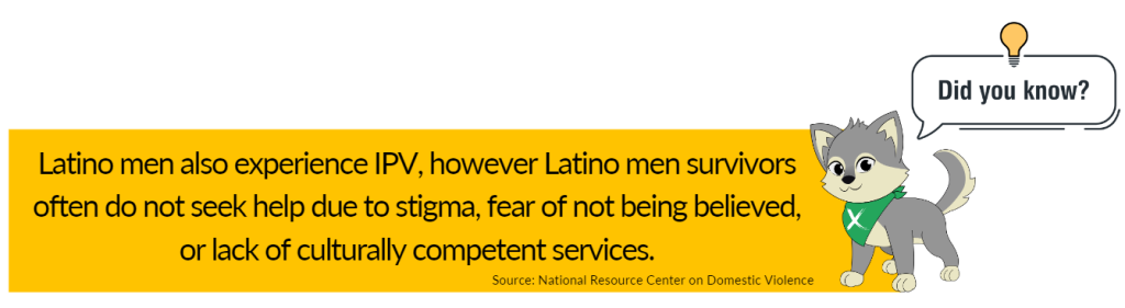 - Despite these numbers, Latino male survivors often do not seek help due to stigma, fear of not being believed, or lack of culturally competent services. National Resource Center on Domestic Violence (NRCDV), 2022