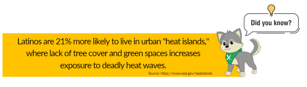 - Latinos are 21% more likely to live in urban “heat islands,” where lack of tree cover and green spaces increases exposure to deadly heat waves. EPA