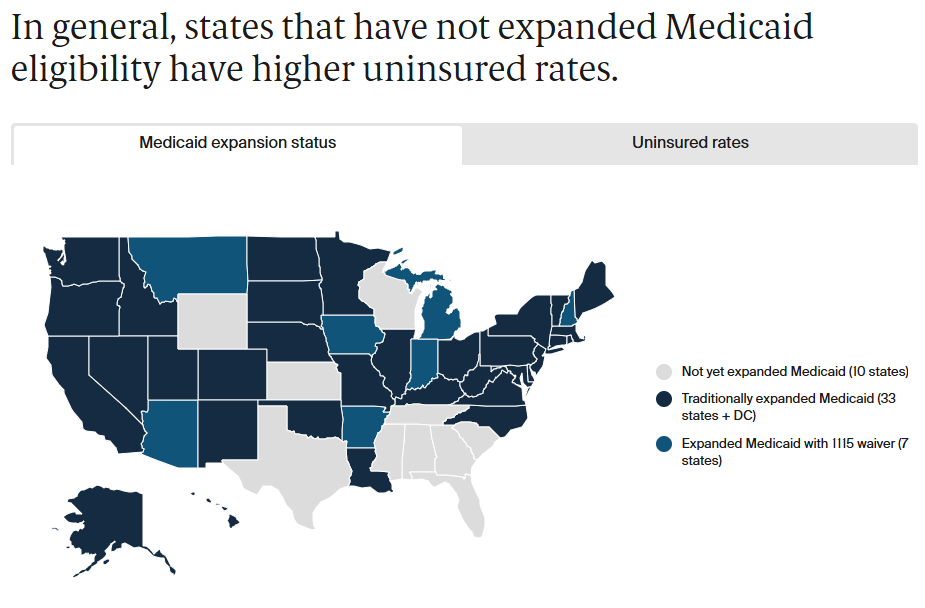 Drake, P., Tolbert, Jennifer, Rudowitz, R., Damico, A., & Kaiser Family Foundation. (2024, February 26). How Many Uninsured Are in the Coverage Gap and How Many Could be Eligible if All States Adopted the Medicaid Expansion? KFF. https://www.kff.org/medicaid/issue-brief/how-many-uninsured-are-in-the-coverage-gap-and-how-many-could-be-eligible-if-all-states-adopted-the-medicaid-expansion/